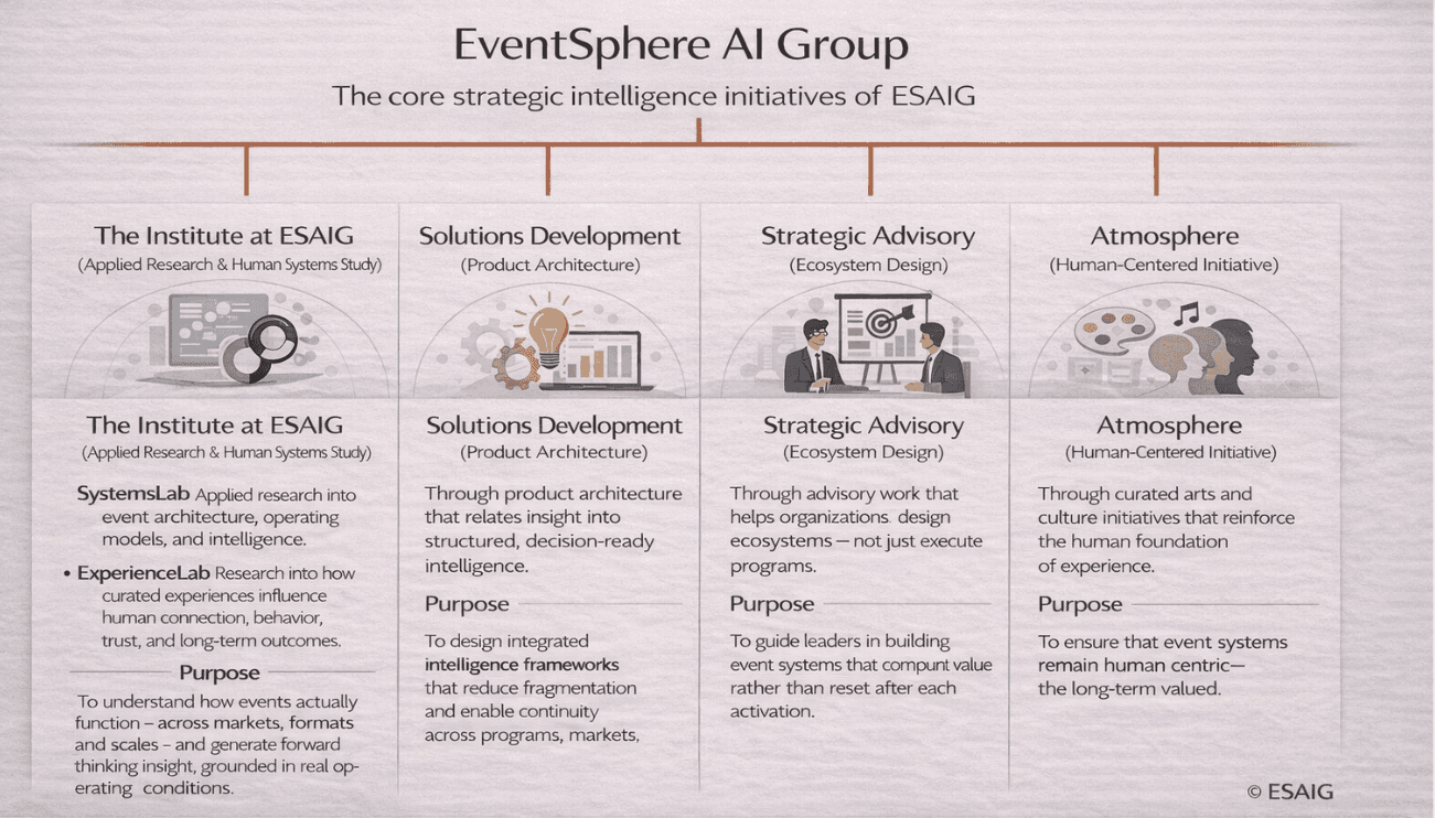EventSphere AI Group (ESAIG) re-imagines how experiences are conceived, structured, and evaluated — bringing together strategy, systems thinking, and human-centered design to create experiences that move organizations forward.